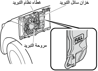 من الخطر العمل بالقرب من مروحة التبريد أثناء تشغيلها. من الممكن أن تستمر المروحة لوقت غير محدد حتى في حالة توقف المحرك وارتفاع درجة حرارة غرفة المحرك. ويمكن أن تتسبب المروحة في إصابتك بإصابة خطيرة.