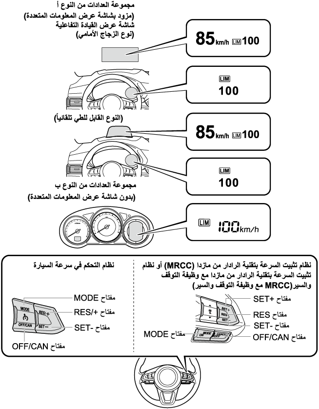 يستطيع نظام تثبيت السرعة بتقنية الرادار من مازدا (MRCC) مع وظيفة التوقف والسير التحول إلى محدد السرعة القابل للضبط (ASL).