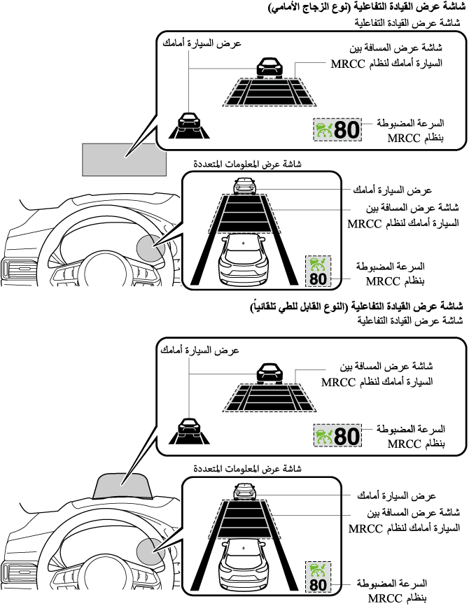 إضافة إلى ذلك، يتم عرض مؤشر عرض نظام تثبيت السرعة بتقنية الرادار من مازدا مع وظيفة التوقف والسير على شاشة عرض المعلومات المتعددة وشاشة القيادة النشطة في الوقت نفسه.
