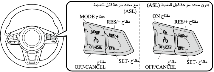 إذا كانت سيارتك المازدا مزودة بمفتاح التشغيل التالي على عجلة القيادة، فهذا يعني أنها مزودة بنظام تثبيت السرعة بتقنية الرادار من مازدا أو نظام نظام تثبيت السرعة بتقنية الرادار من مازدا مع وظيفة التوقف والسير.