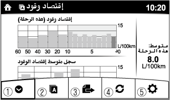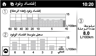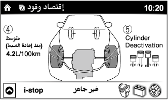 ٣. تعرض النسبة المئوية للوقت الذي توقفت فيه السيارة بفعل تشغيل وظيفة i-stop مطروحاً من إجمالي الوقت الذي توقفت فيه السيارة. |