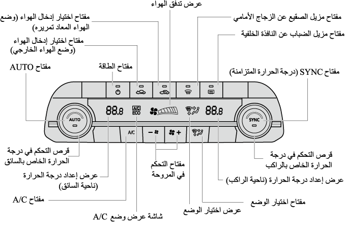 يمكن الاختيار ما بين موضعي الهواء الخارجي أو إعادة تدوير الهواء داخل الكابينة. اضغط المفتاح لاختيار موضعي الهواء الخارجي/إعادة تدوير الهواء.