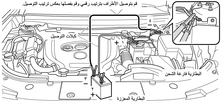 من الخطورة بدء التشغيل بكبل توصيل، إذا تم ذلك بشكل غير صحيح. لذا اتبع الإجراء التالي بحرص. إذا كنت غير واثق من قدرتك على بدء التشغيل بكبل توصيل، نوصيك بشدة أن تستعين بفني صيانة كفء لأداء هذه الوظيفة.