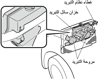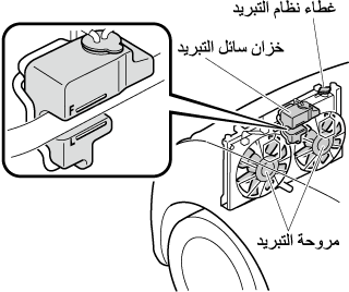 من الخطر العمل بالقرب من مروحة التبريد أثناء تشغيلها. من الممكن أن تستمر المروحة لوقت غير محدد حتى في حالة توقف المحرك وارتفاع درجة حرارة غرفة المحرك. ويمكن أن تتسبب المروحة في إصابتك بإصابة خطيرة.