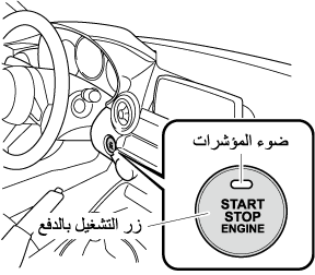 إذا أضاء ضوء التحذير KEY (أحمر)، أو أومض ضوء مؤشر زر التشغيل بالدفع (كهرماني)، فإن ذلك قد يشير إلى أن المحرك قد لا يبدأ تشغيله بالطريقة المعتادة لبدء تشغيله (بالنسبة للسيارات المزودة بمجموعة العدادات من النوع أ (بحث)، يتم عرض الرسائل في مجموعة العدادات). في هذه الحالة، يتعين عليك فحص السيارة لدى فني إصلاح متخصص (نوصي بالاستعانة بفني إصلاح معتمد من قبل شركة مازدا) بأسرع ما يمكن. في حالة حدوث ذلك، يمكن تشغيل المحرك بالدفع. اضغط مع الاستمرار على زر التشغيل بالدفع حتى يعمل المحرك. كما يلزم القيام بإجراءات أخرى ضرورية لبدء تشغيل المحرك مثل حمل المفتاح في المقصورة، والضغط على دواسة القابض (ناقل الحركة اليدوي) أو دواسة الفرامل (ناقل الحركة التلقائي).