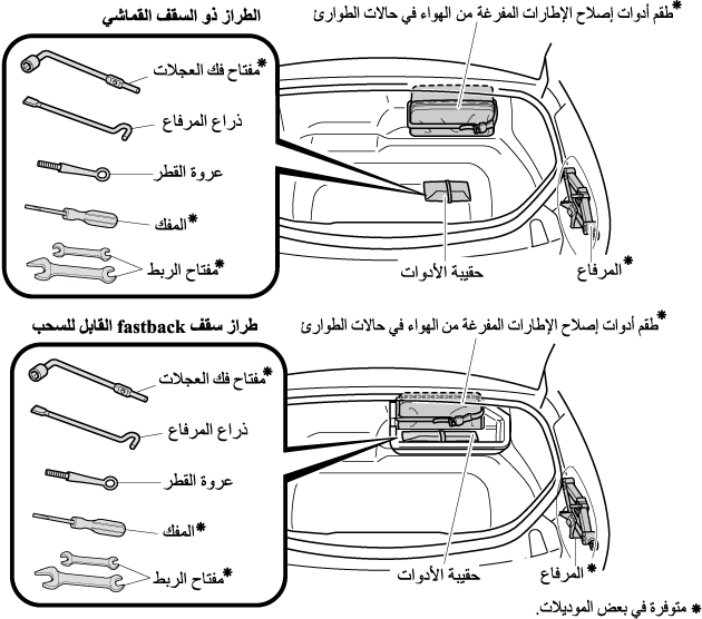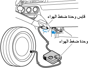 السيارة غير مجهزة بإطار احتياطي. في حالة ثقب أحد الإطارات، استخدم طقم أدوات إصلاح الإطارات المفرغة الهواء في حالات الطوارئ لإصلاح الإطار مؤقتًا. عند إجراء الإصلاح، راجع التعليمات المرفقة بطقم أدوات إصلاح الإطارات المفرغة من الهواء في حالات الطوارئ. إذا جرى إصلاح طارئ لإطار مُفرّغ باستخدام طقم أدوات إصلاح الإطارات المُفرّغة في حالات الطوارئ، اصطحب السيارة لأحد فنيي الصيانة (نوصي بالاستعانة بفني إصلاح معتمد من قبل شركة مازدا) ليقوم بإصلاح أو استبدال الإطار بأسرع ما يمكن.