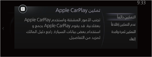 عند توصيل Apple CarPlay للمرة الأولى، يتم عرض شاشة تأكيد تخص تفعيل Apple CarPlay.