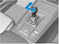 Your vehicle is equipped with a device to prevent shifting to R (reverse) by mistake. Push the shift lever downward and shift to R.