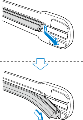 Pull the end of the blade rubber from the blade holder groove in the direction of the arrow and remove the blade rubber from the blade holder.