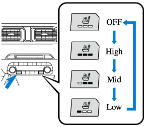 Press the seat ventilation switch while the ignition is switched ON to operate the seat ventilation. The indicator lights turn on to indicate that the seat ventilation is operating. The mode changes as follows each time the seat ventilation switch is pressed.