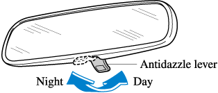 Push the antidazzle lever forward for day driving. Pull it back to reduce glare of headlights from vehicles at the rear.