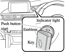 The engine starts by pressing the push button start while depressing the brake pedal. To switch the ignition position, press the push button start without depressing the pedal.