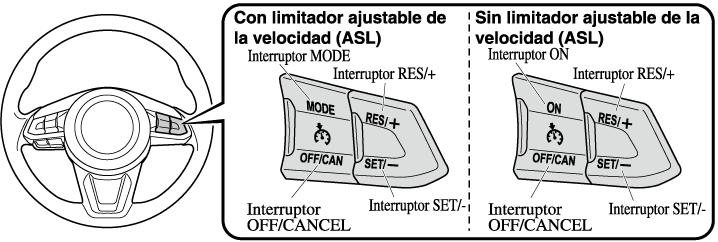 Si su Mazda cuenta con el siguiente interruptor de dirección, también está equipado con el sistema de control de crucero de radar de Mazda (MRCC) o con el sistema de control de crucero de radar de Mazda con la función Stop & Go (MRCC con función Stop & Go).