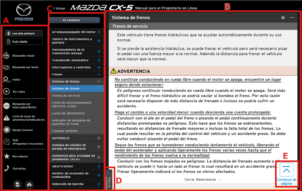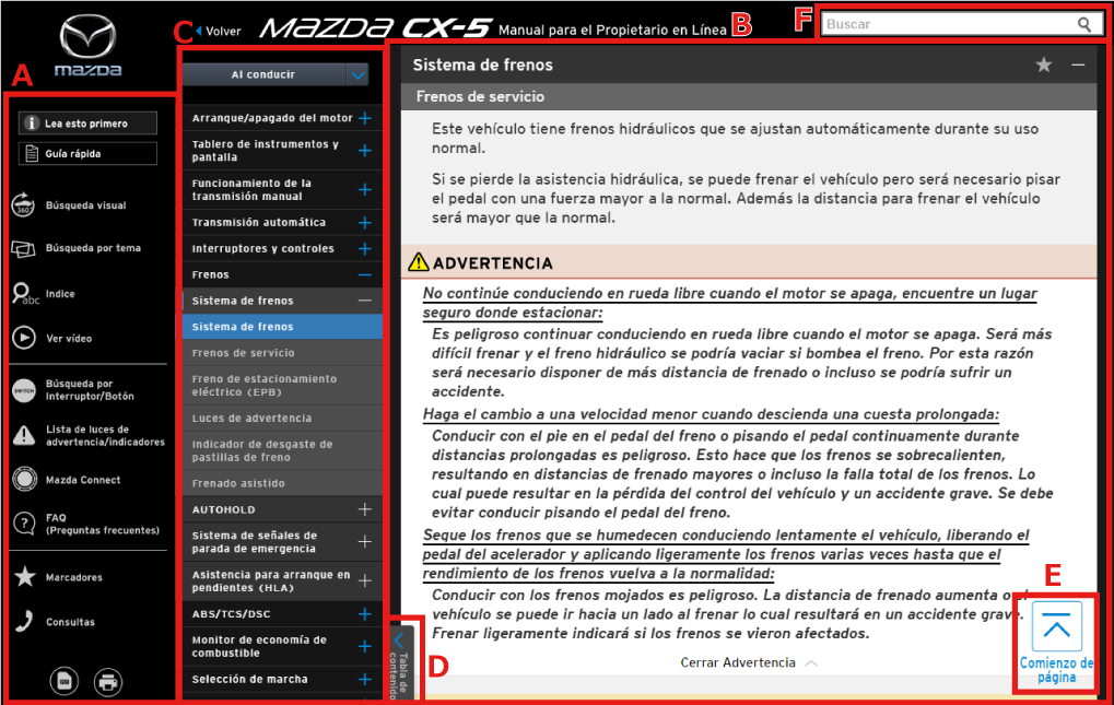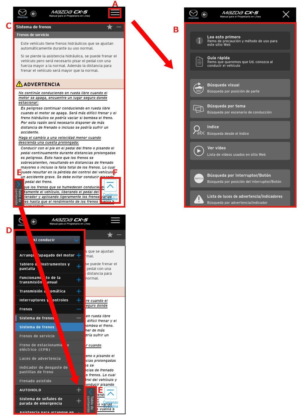 Las figuras complementan el texto para explicar mejor como disfrutar de su Mazda. Leyendo este Manual para el propietario en línea podrá aprender acerca de todas las funciones, información sobre aspectos importantes de la seguridad y sobre la forma de conducir en diferentes condiciones.