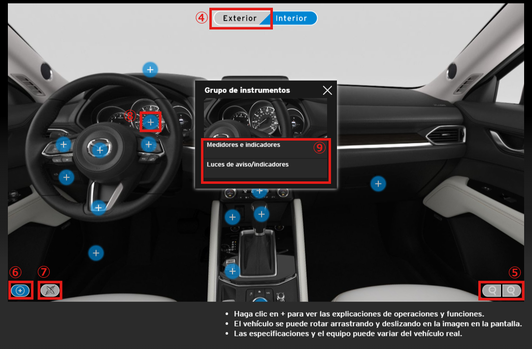 Además, si está usando un teléfono móvil u otro dispositivo que tiene una función de giróscopo, los ángulos en el interior del vehículo se pueden cambiar moviendo el dispositivo (sólo imágenes del interior del vehículo).
