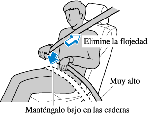 El posicionamiento incorrecto de los cinturones de seguridad es peligroso. Si no están bien ubicados, los sistemas de pretensores y el sistema de limitación de carga no podrán proveerle de la protección adecuada en caso de un accidente y puede resultar en heridas serias. Para más información acerca de cómo usar los cinturones de seguridad, consulte la sección “Abrochándose los cinturones de seguridad” (Buscar).