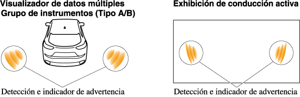 Si existe la posibilidad de un choque con un vehículo que se aproxima, los indicadores de advertencia de control de puntos ciegos (BSM) destellan y la advertencia sonora se activa simultáneamente.