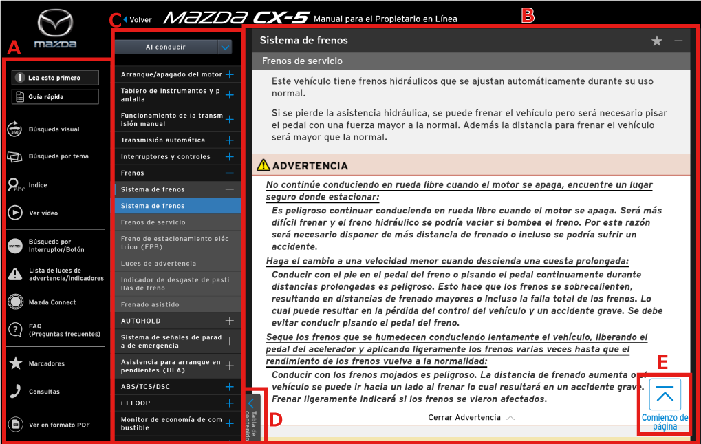Las figuras complementan el texto para explicar mejor como disfrutar de su Mazda. Leyendo este Manual para el propietario en línea podrá aprender acerca de todas las funciones, información sobre aspectos importantes de la seguridad y sobre la forma de conducir en diferentes condiciones.
