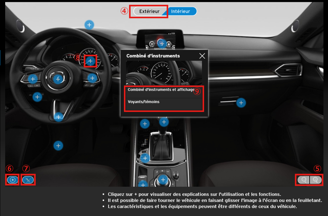 Además, si está usando un teléfono móvil u otro dispositivo que tiene una función de giróscopo, los ángulos en el interior del vehículo se pueden cambiar moviendo el dispositivo (sólo imágenes del interior del vehículo).