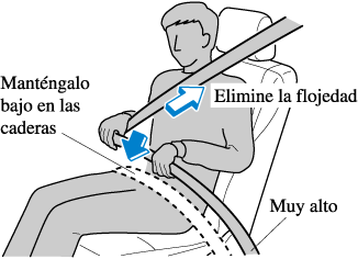 La parte de la falda del cinturón de seguridad usada muy alta es peligrosa. En caso de accidente, concentrará la fuerza del impacto en el área abdominal causando heridas graves. Use la parte de la falda del cinturón de seguridad bien firme y tan bajo como sea posible.