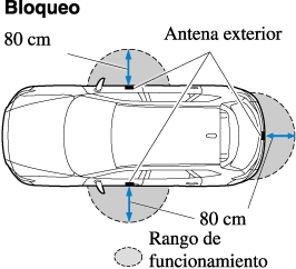 Cuando la carga de la pila está baja, o en lugares donde hay ondas de radio de alta intensidad o ruido, el rango de funcionamiento puede reducirse o el sistema podría no funcionar. Para determinar el cambio de la pila, consulte la sección Sistema de seguridad sin llave (Buscar).