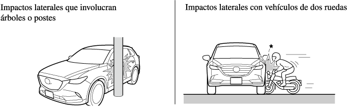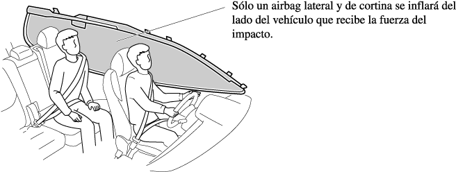 Cuando los sensores de choque de los airbags de aire detectan un choque lateral de mayor fuerza que moderada, el sistema infla solo el airbag lateral del lado del vehículo que ha sufrido la colisión. La bolsa de aire lateral se infla rápidamente para reducir las heridas en el pecho del conductor o acompañante al golpearse directamente con partes del interior como una puerta o ventanilla.