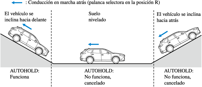 La función AUTOHOLD se cancela cuando la palanca selectora se cambia a la posición R con el vehículo en un lugar plano, o en una pendiente mirando hacia arriba (como se muestra abajo).