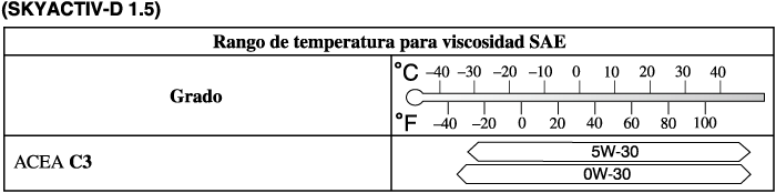 De manera de mantener el intervalo de mantenimiento (Buscar) y para proteger el motor de daños causados por mala lubricación, es de vital importancia usar aceite de motor con la especificación correcta. No use aceites que no cumplan con las siguientes especificaciones o requerimientos. El uso de aceites inapropiados puede dañar el motor y dejarlo sin cobertura de la garantía de Mazda.