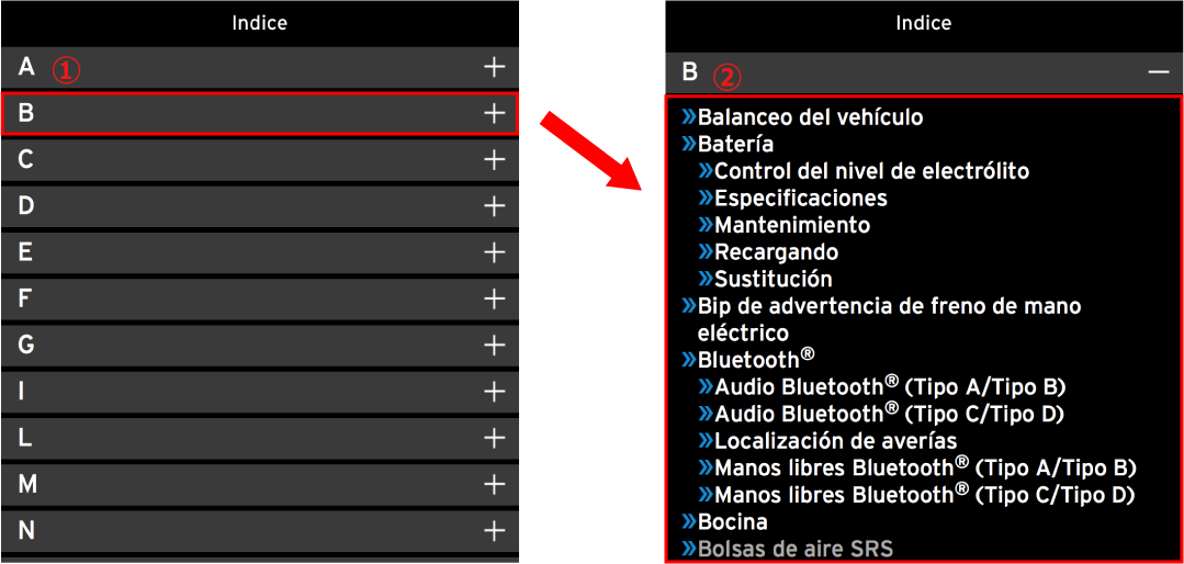 Buscar y ver explicaciones de las operaciones y funciones para el área deseada en el vehículo.