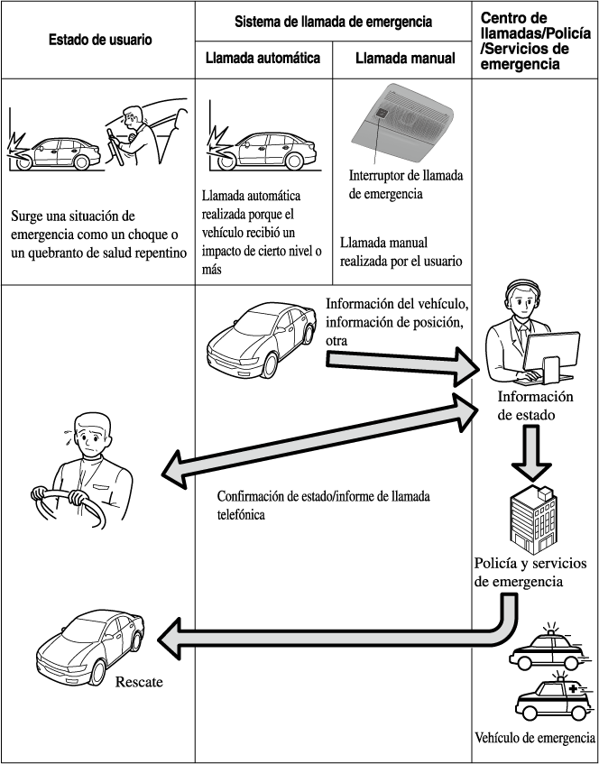 Si el vehículo recibe un impacto de cierto nivel o más en un choque, el sistema de llamada de emergencia comenzará a funcionar automáticamente.