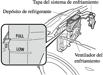 Si el ventilador de enfriamiento no funciona mientras el motor está funcionando, la temperatura del motor aumentará. Apague el motor y llame a un técnico experto, le recomendamos un técnico autorizado Mazda.