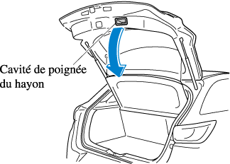 Ouvrir complètement le hayon et s'assurer qu'il reste ouvert. Si vous n'ouvrez le hayon que partiellement, il pourrait se refermer brutalement en raison de vibrations ou de rafales de vent et causer des blessures.