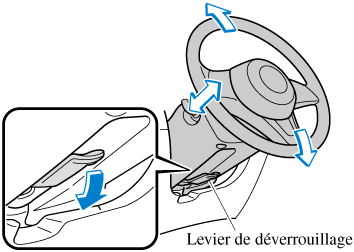 Arrêter le véhicule, puis tirer vers le bas le levier de déverrouillage situé sous la colonne de direction.