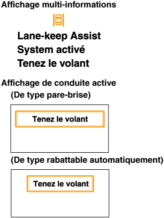 Si la caméra de détection avant (FSC) ne peut pas fonctionner normalement en raison de températures élevées, les fonctions associées sont temporairement interrompues et les voyants d'avertissement suivants s'allument. Ceci n'indique toutefois pas une anomalie. Refroidir la zone autour de la caméra de détection avant (FSC), par exemple en activant le climatiseur.