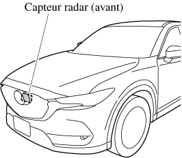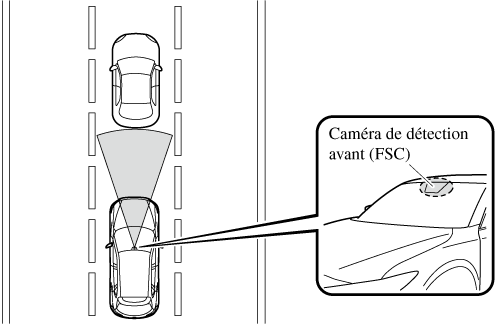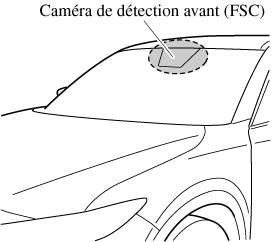 Ne pas heurter ou exercer une force considérable sur la caméra de détection avant (FSC) ou sur la zone environnante. Si la caméra de détection avant (FSC) subit un choc important ou que la zone qui l'entoure montre des fissures ou d'autres dommages provoqués par des projections de gravillons ou de débris, cesser d'utiliser les systèmes suivants et consulter un mécanicien expérimenté, un mécanicien agréé Mazda est recommandé.