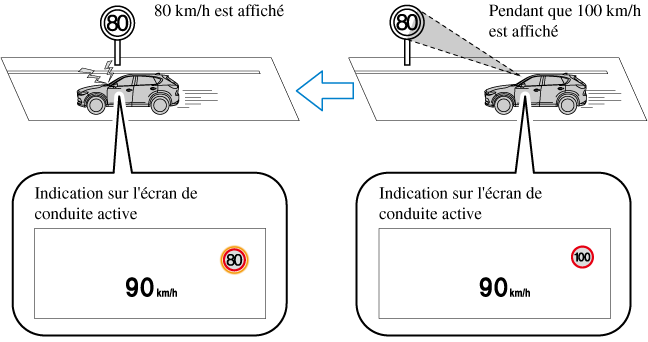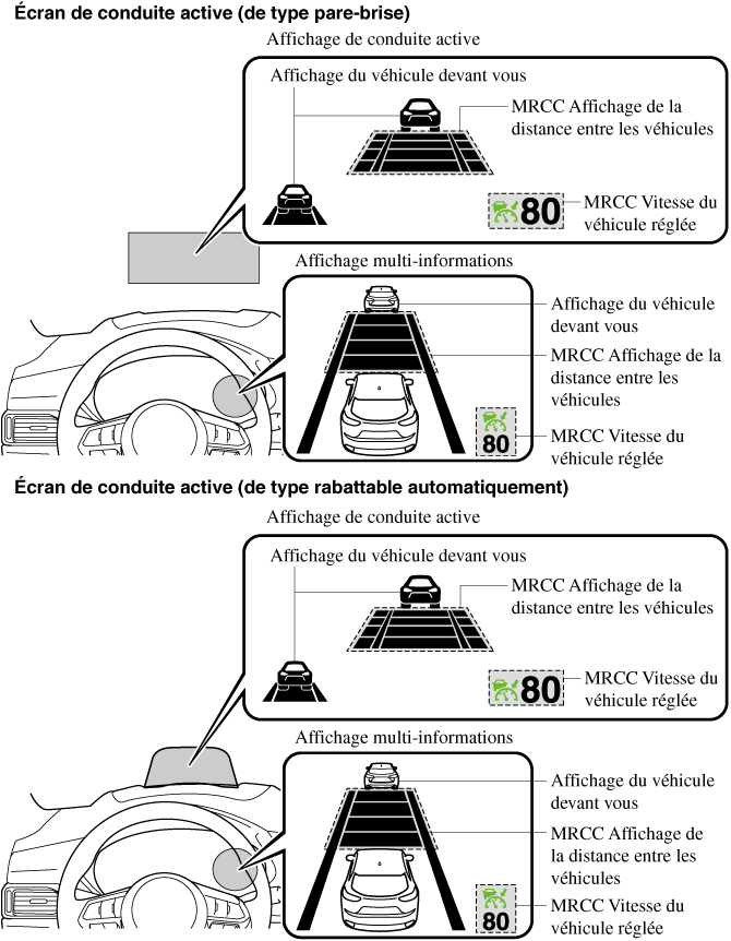 Indication d'avertissement du régulateur de vitesse à radar Mazda avec fonction Stop & Go (MRCC avec fonction Stop & Go)