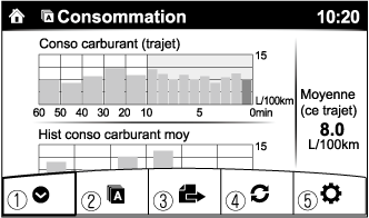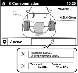 Affiche le montant actuel de fois que la fonction i-stop a été en fonctionnement et le montant cumulé de temps qu'elle a fonctionné.