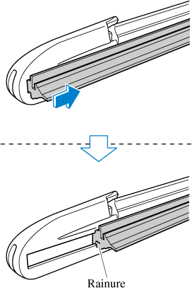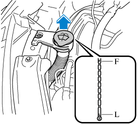 Si le niveau se trouve au niveau ou à proximité du repère L, ajouter suffisamment de liquide de refroidissement spécifié dans le réservoir de liquide de refroidissement pour la protection contre le gel et la corrosion et porter le niveau jusqu'au repère F.