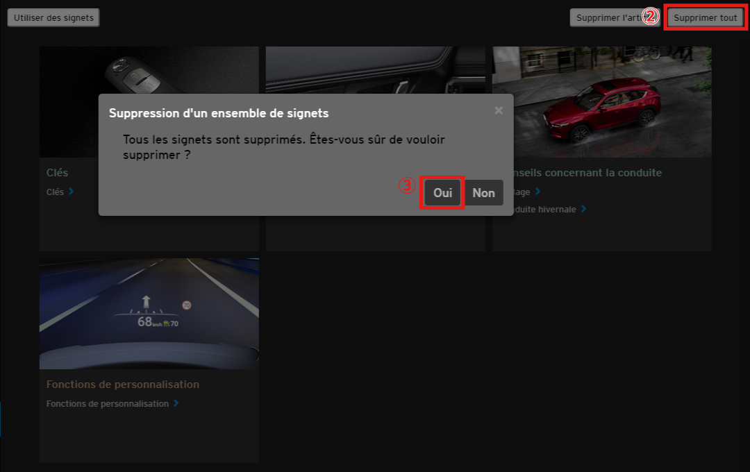 Tous les éléments enregistrés sont supprimés lorsque vous sélectionnez "Oui".