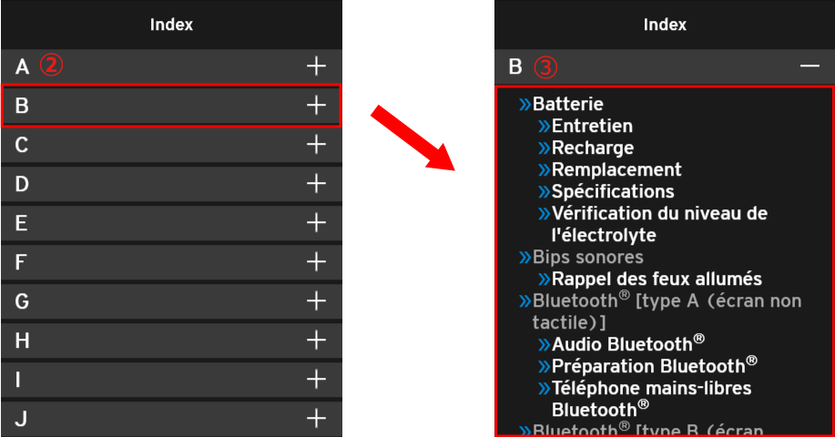 - Il existe deux méthodes pour afficher l'index. L'affichage bascule automatiquement sur l'affichage qui est la plus adapté à la taille d'écran de l'appareil utilisé.