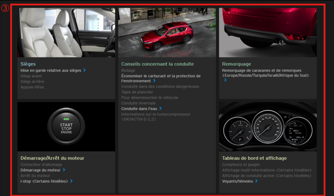 Les illustrations complètent le texte afin de vous expliquer comment profiter au mieux de votre Mazda. Toutes les caractéristiques, informations relatives à la sécurité et conduites adaptées aux différentes conditions sont expliquées dans ce manuel Conduite et Entretien en ligne.