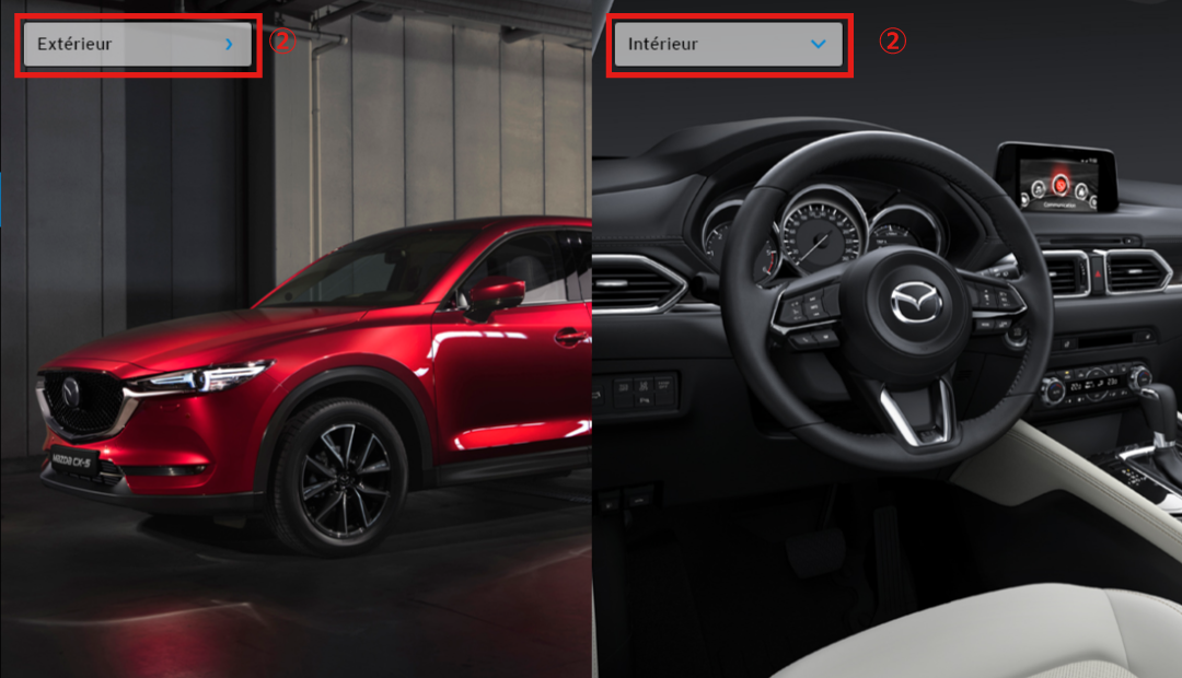 Vous pouvez basculer entre les images intérieures et extérieures du véhicule.
