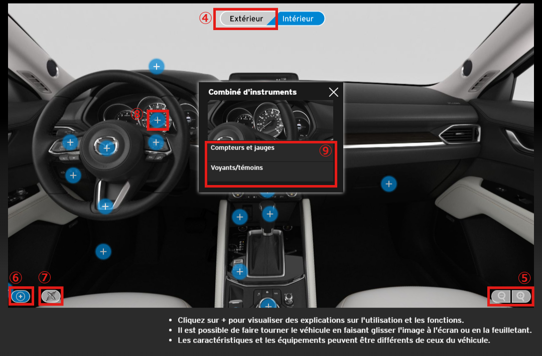 De plus, si vous utilisez un téléphone mobile ou un autre dispositif informatique équipé d'une fonction gyroscopique, vous pouvez modifier les angles à l'intérieur du véhicule en déplaçant l'appareil (images intérieures du véhicule uniquement).