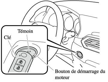 Si le voyant KEY (rouge) s'allume ou que le témoin du bouton de démarrage du moteur (ambre) clignote, il est possible que le système de démarrage du moteur présente un problème. Ceci peut empêcher le moteur de démarrer ou de passer le contacteur sur ACC ou ON (pour les véhicules équipés d'un tableau de bord de type A/type B (Rechercher), les messages s'affichent sur celui-ci). Faire inspecter dès que possible le véhicule par un mécanicien expérimenté. Nous vous recommandons un mécanicien agréé Mazda.
