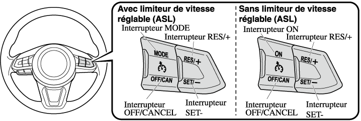 Si votre Mazda dispose des interrupteurs au volant suivants, alors elle est équipée du système de régulation de vitesse à radar Mazda (MRCC) ou du système de régulation de vitesse à radar Mazda avec fonction Stop & Go (MRCC avec fonction Stop & Go).