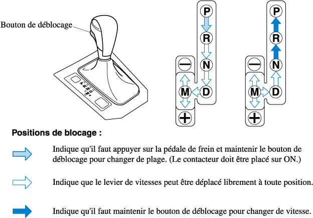 • Lorsque le contacteur est sur ACC ou désactivé, il n'est pas possible de déplacer le levier sélecteur depuis la position P.