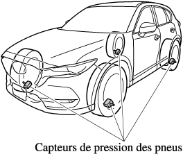 Les capteurs de pression des pneus installés sur chaque roue envoient les données d'information de pression de gonflage par signal radio au récepteur situé dans le véhicule.