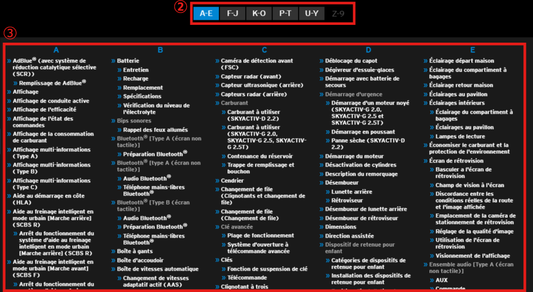 Les éléments répondant aux mots-clés saisis dans le champ ② s'affichent. En sélectionnant l'élément que vous souhaitez examiner, des explications sur son utilisation et ses fonctions s'affichent.