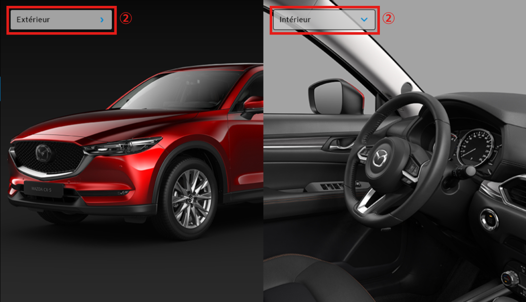 Vous pouvez basculer entre les images intérieures et extérieures du véhicule.