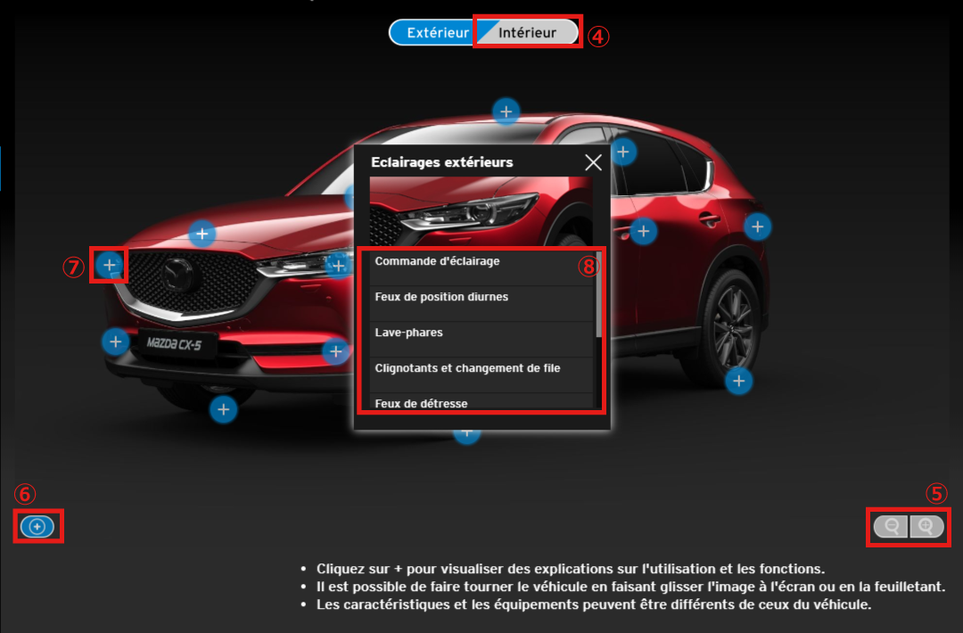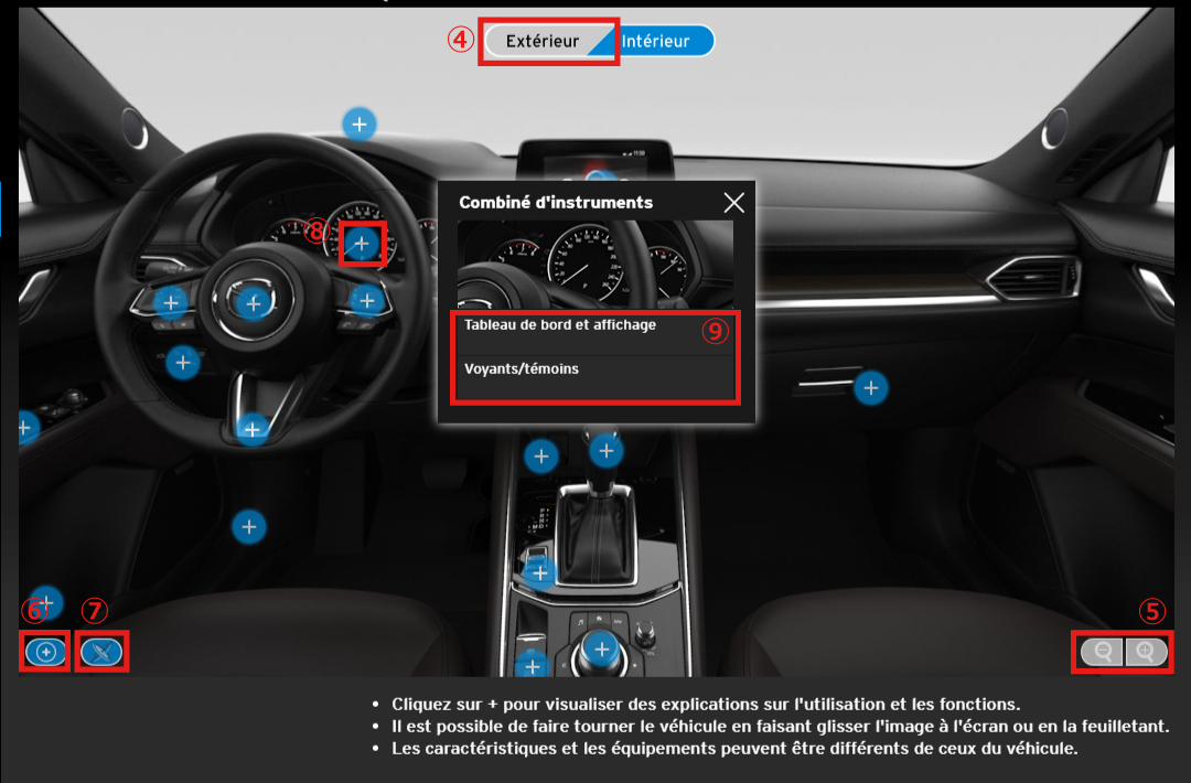 De plus, si vous utilisez un téléphone mobile ou un autre dispositif informatique équipé d'une fonction gyroscopique, vous pouvez modifier les angles à l'intérieur du véhicule en déplaçant l'appareil (images intérieures du véhicule uniquement).